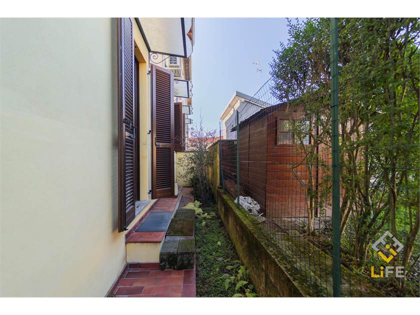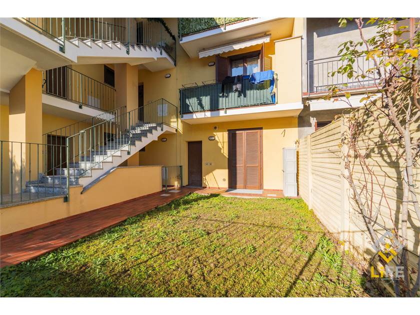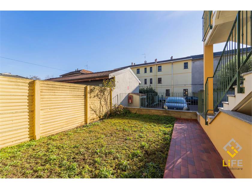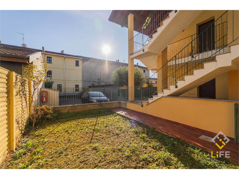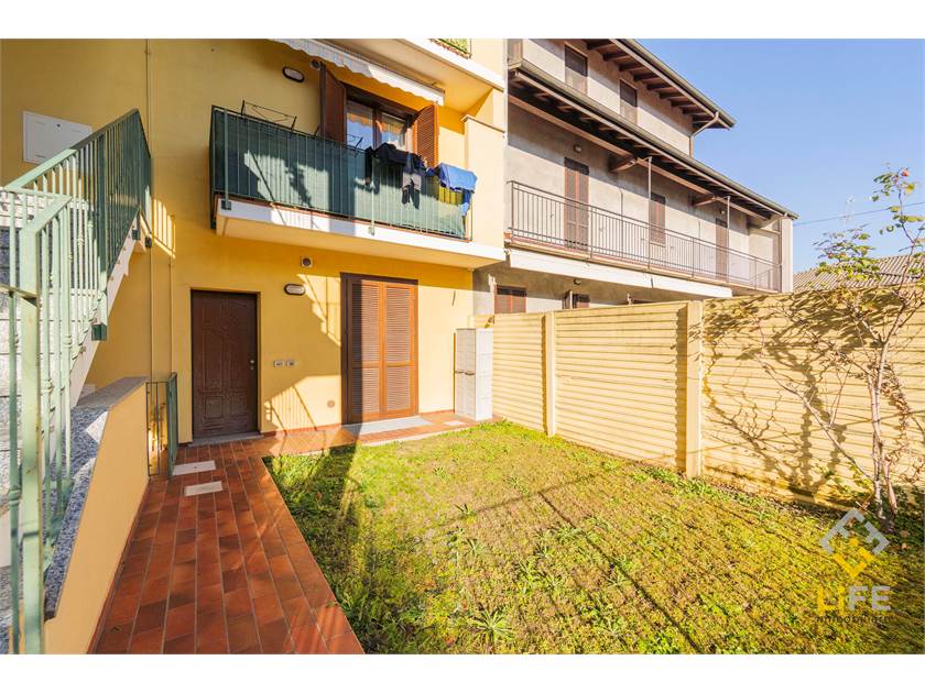 L’ingresso è nella zona giorno con cucina a vista, che si apre sul portichetto e sul giardino esclusivo. La casa è ben organizzata, con camera, bagno e spazi pratici da vivere ogni giorno, oltre a cantina ampia e box.