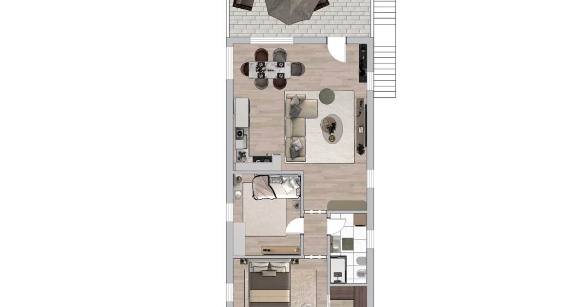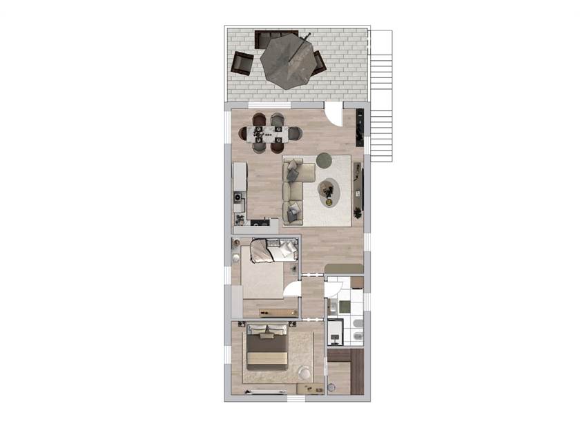 Un ampio soggiorno con cucina a vista si apre sul terrazzo, perfetto per respirare tranquillità.