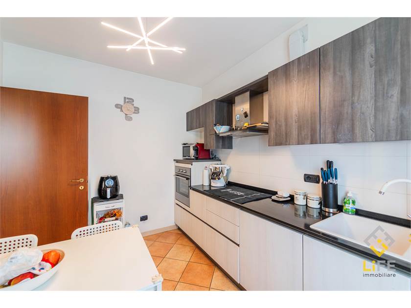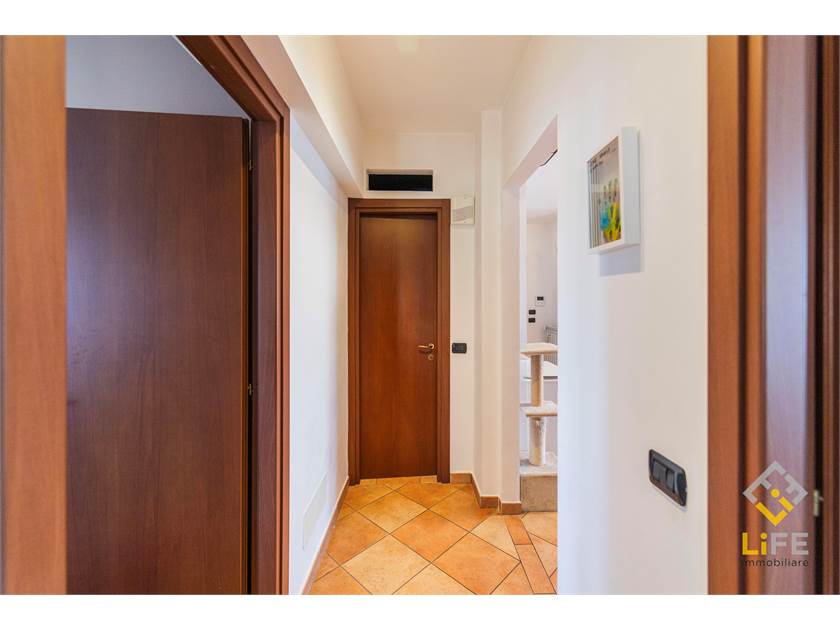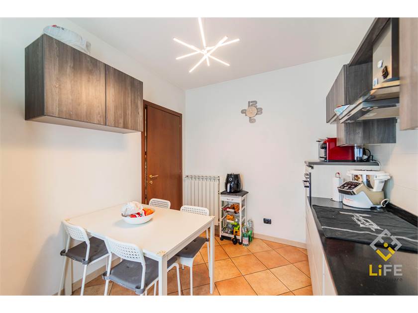 L’appartamento è molto luminoso, grazie alla tripla esposizione, e regala una vista aperta sui monti che accompagna le giornate con una sensazione costante di respiro e calma. Il terrazzino del soggiorno diventa uno spazio da vivere: colazioni al sole, pranzi all’aperto nelle belle stagioni, momenti di relax dopo una giornata intensa.