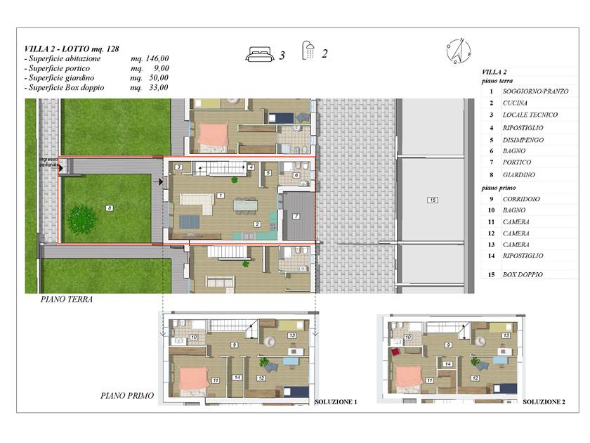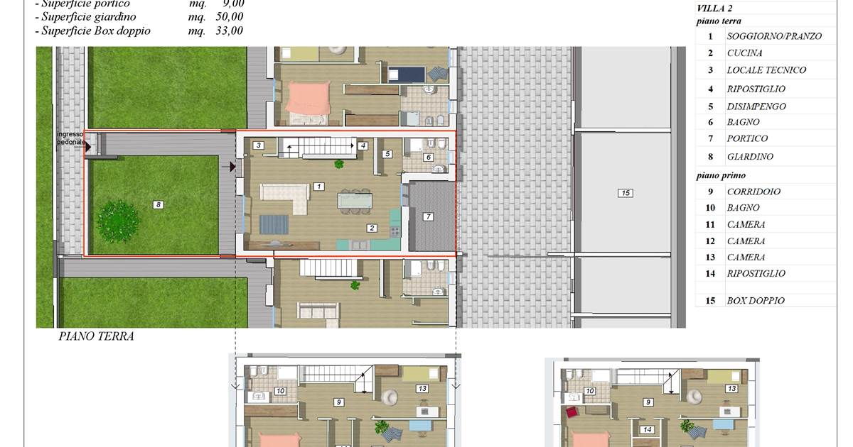 L’ingresso conduce a un luminoso soggiorno con cucina a vista che si apre sul portico, ideale per vivere gli spazi esterni in ogni stagione. Al piano terra trovano spazio anche un comodo ambiente lavanderia e il bagno. Al piano superiore la zona notte ospita tre camere, un secondo bagno e la possibilità di ricavare una cabina armadio, adattando la casa alle tue esigenze.